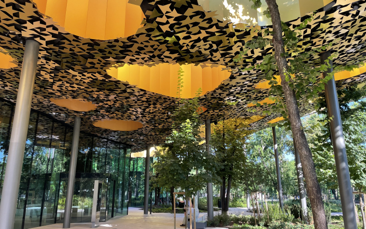 Mint a közlemény emlékeztet, a japán építész hatalmas üvegfalat tervezett, ami körülöleli a házat, átláthatóságot és légiességet kölcsönözve neki. Az épület másik, ikonikus jellemzője az organikus tetőszerkezet: a "lebegő kalap", amelyet a hanghullámból kiindulva hajlított meg a tervező, ráadásul a tetőzet felületét csaknem 100 egyedi tervezésű lyuk töri át.