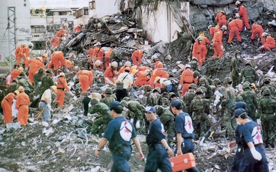 A mentők számos daruval igyekeznek utat nyitni a 6,4-es erősségű földmozgás által ledöntött épület darabjai között azokhoz, akik esetleg a "csodával határos módon" túlélték a katasztrófát.